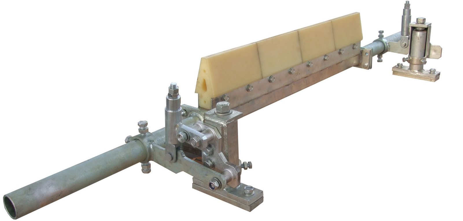 重錘刮板式清掃器,它采用重錘杠桿是清掃刮板緊貼輸送帶,更適用于輸送磨蝕性小,較干燥的和不易粘附到輸送帶上的物料的輸送機使用。